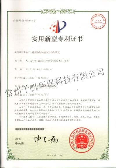 實(shí)用新型專(zhuān)利證書(shū) 一種整體化油煙廢氣凈化裝置