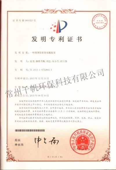 發(fā)明專(zhuān)利證書(shū) 一種預(yù)埋管維修堵漏裝置