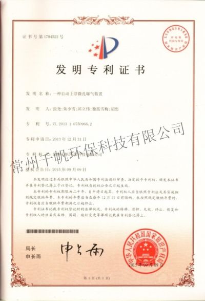 發(fā)明專(zhuān)利證書(shū) 一種自動(dòng)上浮微孔曝氣裝置