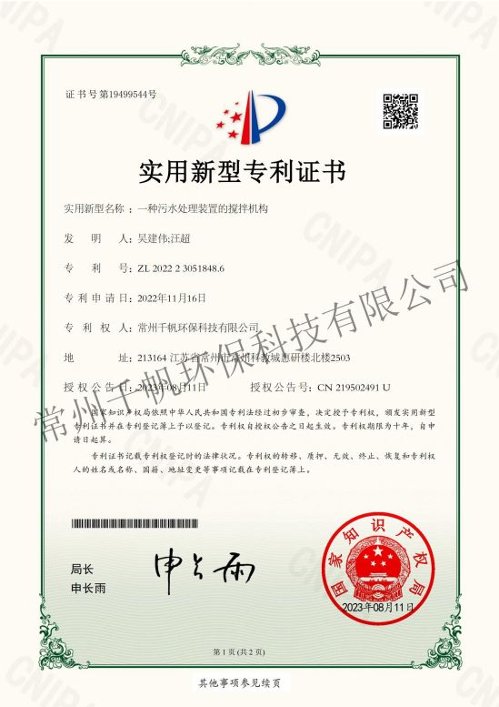 實(shí)用新型專(zhuān)利證書(shū) 一種污水處理裝置的攪拌機(jī)構(gòu)